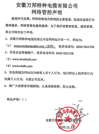 鄭重聲明:安徽萬邦特種電纜有限公司官方網站為:www_wanbangcable_com.800778.cn,除此之外無任何子網站或合作網站,其余均為假冒偽劣。電話:0550-7621728 13485756353 地 址:安徽省天長市滁州高新技術產業開發區經四路29號